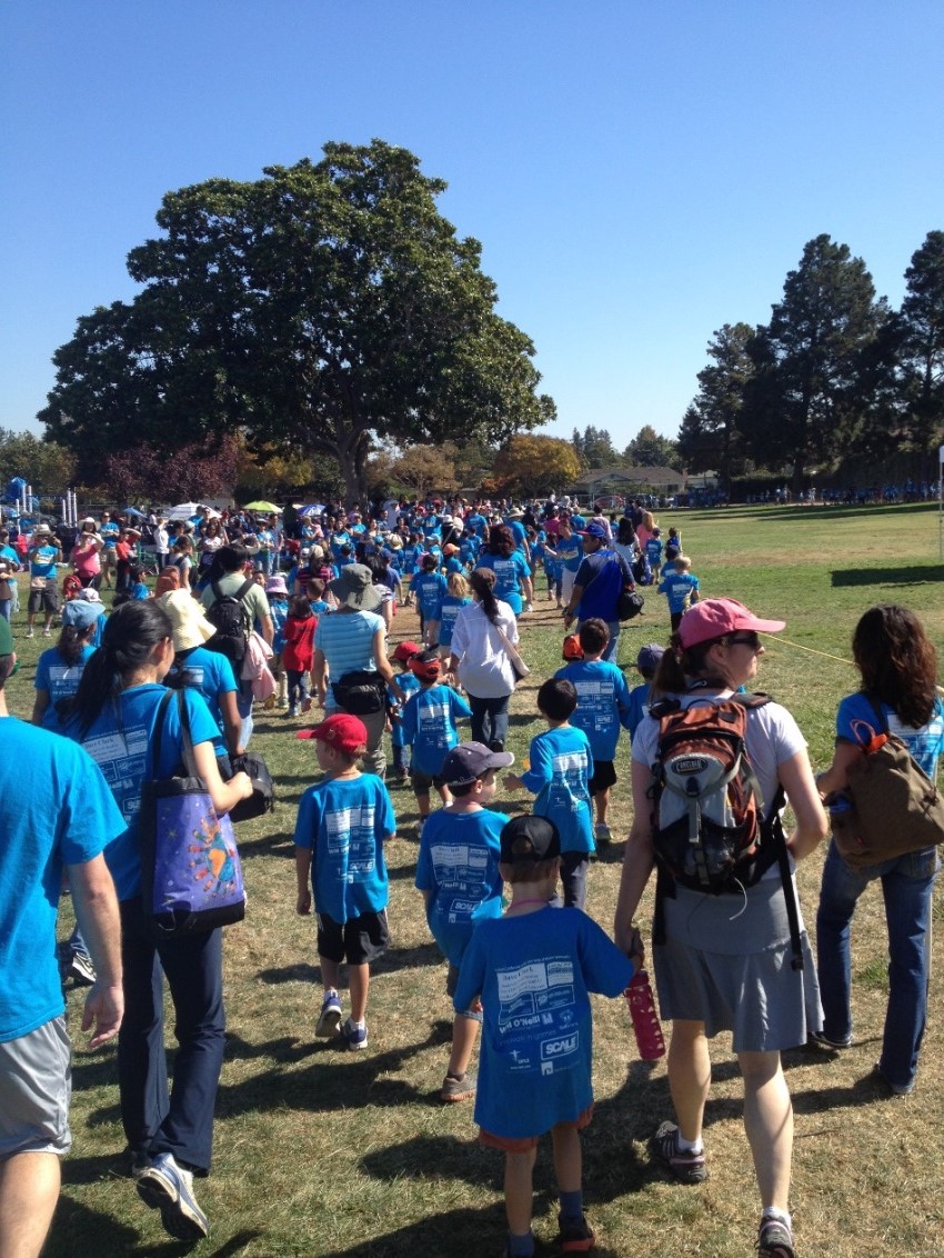 As is common around here, the school has an annual community event called a “Walk-a-Thon” in which donations are collected towards the funding of various programs such as music, band, science, arts, field trips and technology. Most of the money comes from parents (and relatives) that commit to payments proportional to the distance (number of laps) walked by their kids. The next picture shows the first lap.