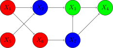 A Markov network is like a Markov chain, but with more random variables and a more interesting structure. Imagine that we have a graph, where each node is associated with a random variable and the edges encode possible correlations. A Markov network has the property that if we take any disjoint collection of nodes ,