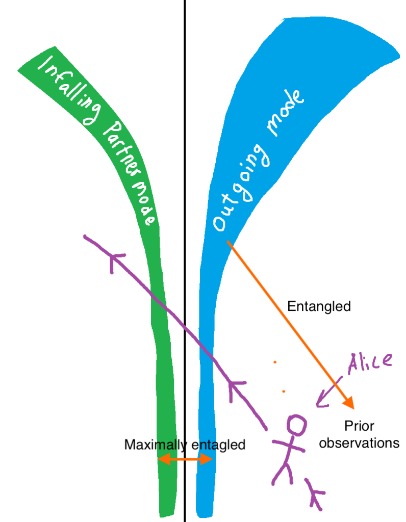 However, given our discussion on Hawking radiation about short-range entanglement, the outgoing mode must be maximally entangled with an in-falling partner mode. This contradicts monogamy of entanglement! The outgoing mode cannot be entangled both with the radiation Alice has already collected and also maximally entangled with the nearby infalling mode!