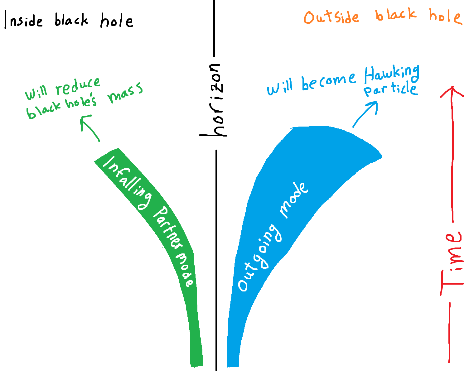 One simplified way to understand the Hawking radiation is by thinking about highly coupled modes (think “particles”) being formed continuously near the horizon. As this formation must conserve the conservation of energy, one of these particles has negative energy and one of the particles has the same energy but with a positive sign and hence, they are maximally entangled (if you know the energy of one of the particles, you know the energy of the other one): we will be referring to this as short-range entanglement. The one with negative energy falls into the black hole while the one with positive energy comes out as Hawking radiation. The maximally-entangled state of the modes looks like: