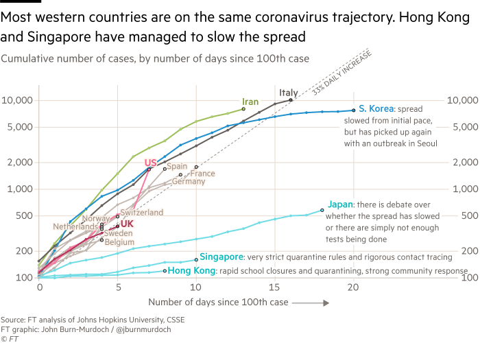 I was hoping that reducing meetings and activities will be good for research, but currently find it hard to concentrate on anything except this train-wreck of a situation. The financial times has a chart that summarizes the progress of the disease in several countries: