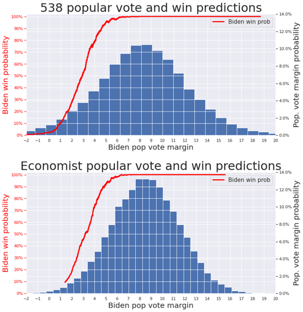 Much of the methodological difference, including the issue of pairwise correlations, should manifest in 2, but eyeballing it, they don’t seem to differ that much. It seems that conditioned on a particular margin, both models give Biden similar probability to win. (In particular both models think that 3% margin is about 50/50, while 4% margin gives Biden about 80/20 chance). The main difference is actually in the first part of estimating the popular vote margin – 538 is more “conservative” and has fatter tails.
