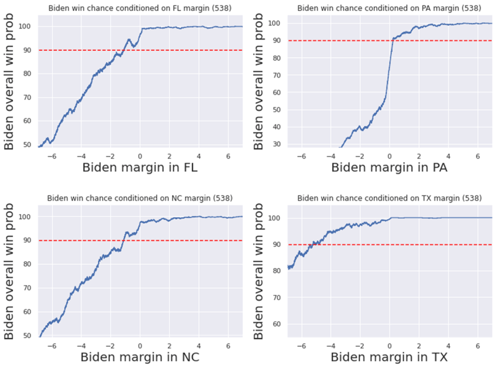 The following graphs show the updated win probability conditioned on a particular margin in a state. We see that winning or losing Florida, North Carolina, and Texas on their own doesn’t make much difference to the probability – it’s all about the margin. In contrast, losing Pennsylvania’s 20 electoral votes will make a significant difference to Biden’s chances.