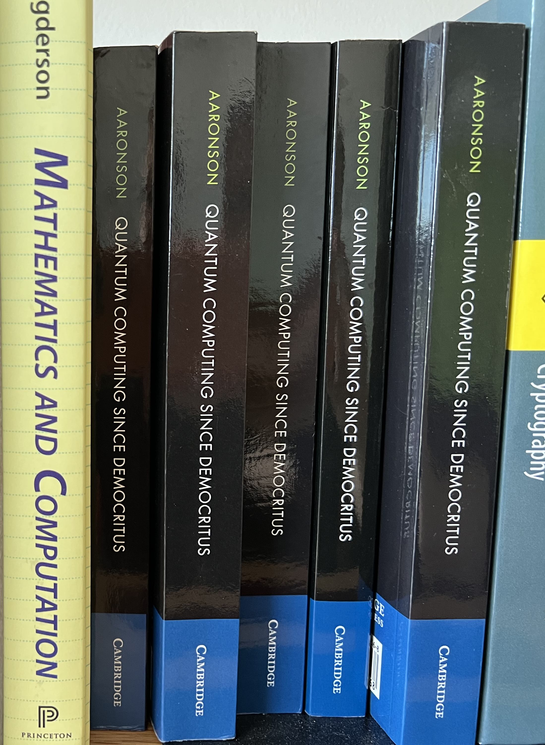 This is a photo of my book shelf at the office. Ever since joining Harvard, I have been ordering copies of Quantum Computing Since Democritus on a regular basis. I often hand them out to bright students, curious about science, whom I want to expose to the beautiful connections between computer science, math, physics, and even philosophy. Scott has been one of the great popularizers of our field even before he started blogging in 2005. His surveys and blog posts provide some of the best introductions to our field. For example, when investigating P vs NP and physical reality, Scott actually went out and verified that nature indeed cannot solve an NP-complete problem via finding the globally minimal energy configuration of soap bubbles. Through his blog, popular writing, and research, Scott has done more than anyone else to introduce new people of all backgrounds to theoretical computer science.