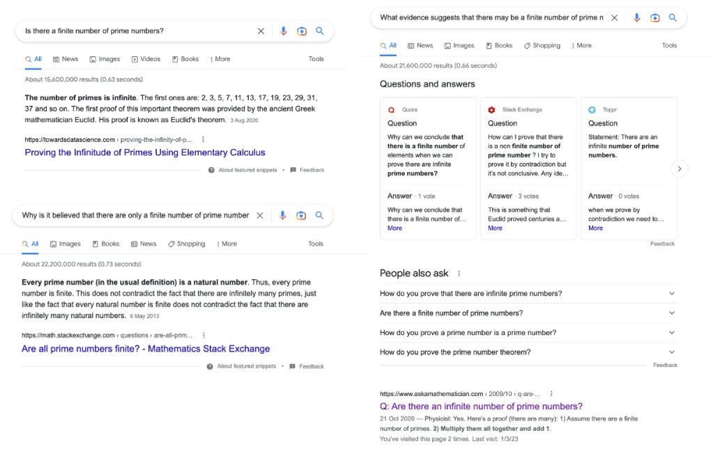 However, large language models have one huge advantage over Leonard Shelbey: they can time travel. Specificially, ChatGPT can figure out the questions that are supposedly answered by its response. It can then query these questions to a search engine (e.g. Google) and use the information to come up with better responses. Specifically, in the context of the “number of primes” interaction, if we ask ChatGPT to “List the questions answered by your response above” then it responds with the following: